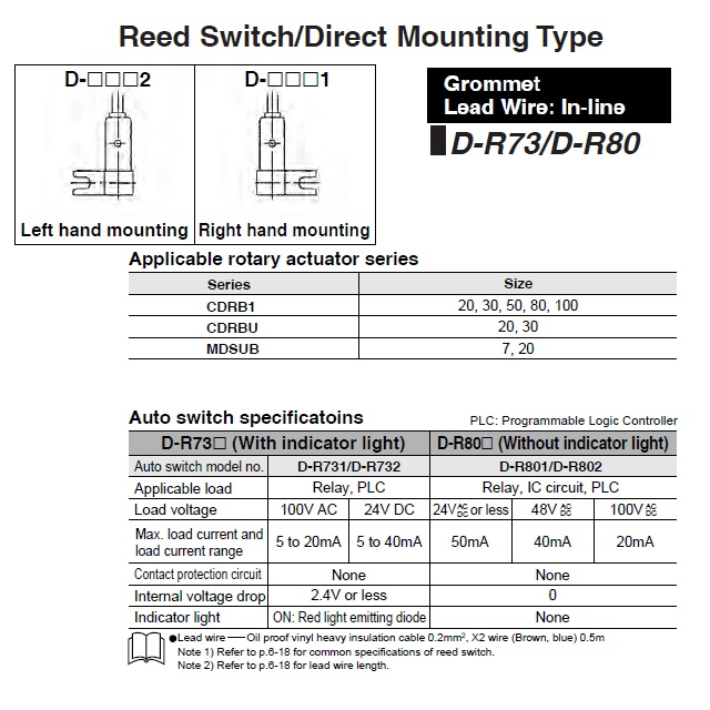 D-R73x/R80x, Jazýčkový snímač polohy, přímá montáž, vodiče.Použití: elektronické obvody / relé / PLC, 24 V DC relé / PLC.Napájecí napětí: 100 V/AC / 100 V/DC, maximální proud 5 až 50 mA.Pro pohony řady: CDRB, MDSU.