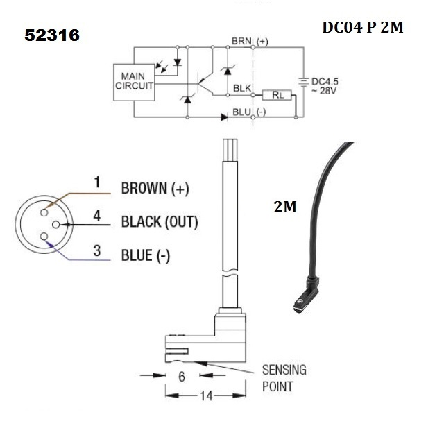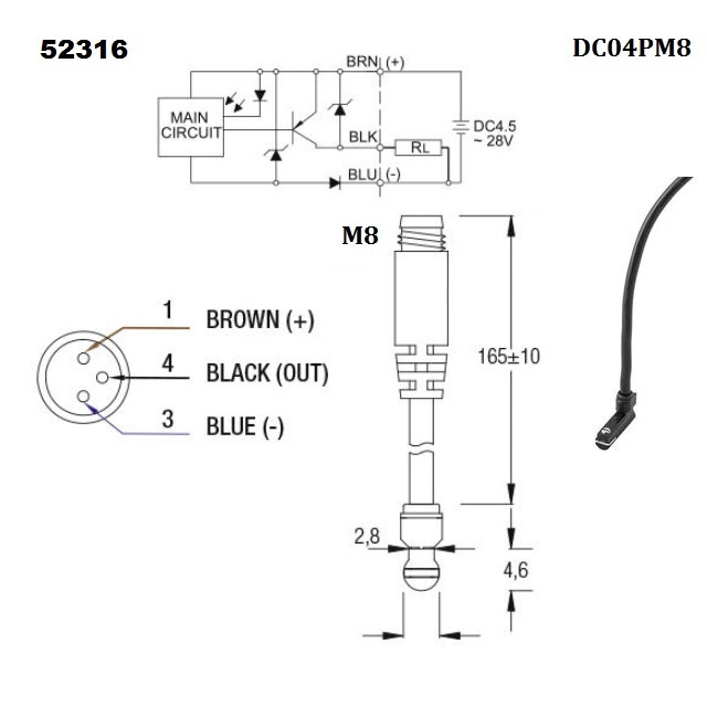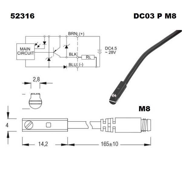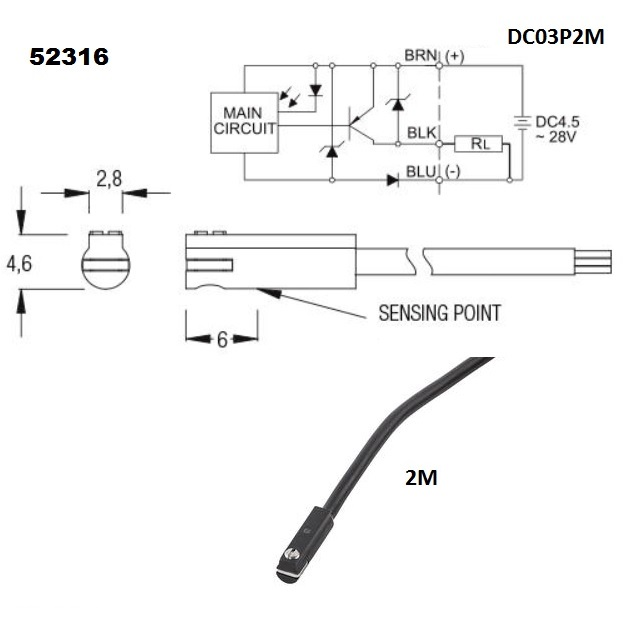 VariantyDC03P2M; Délka (m) 2, Série SENZOR, Připoj. závit -, Napětí DC4,5-AC28V, Hmotnost (kg) 0,028, Ovládání 3 vodiče, PNP, Poznámka 3 vodiče, lineární LED