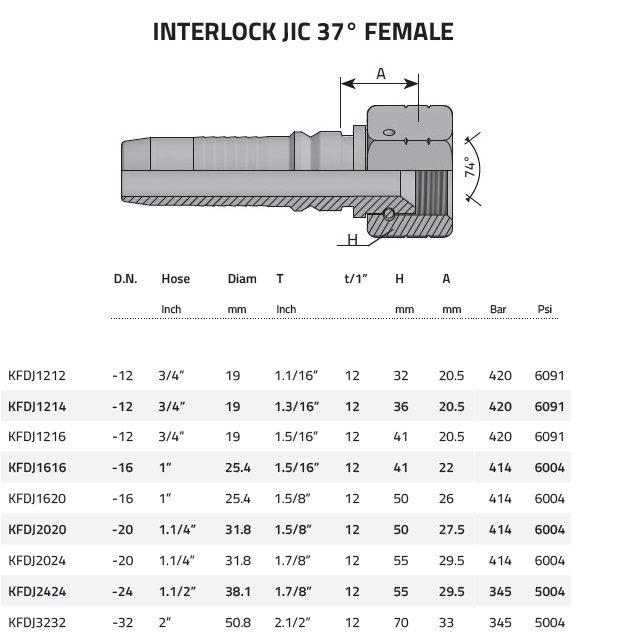 VariantyKFDJ1212; Celková délka (mm) L=82,5, Provozní tlak (bar) 420, Vnitřní závit 1.1/16"-12, DN (mm) 20, Hmotnost (kg) 0,186, Velikost [modul] (-12), Šestihran 32, Hadice d/D 3/4"