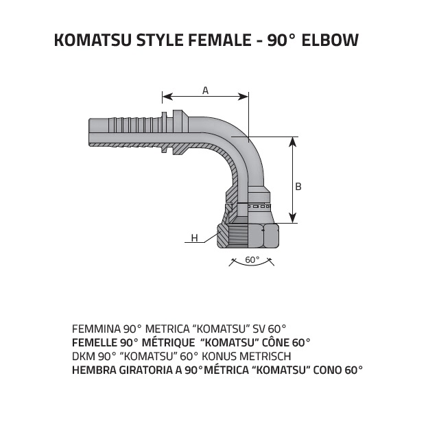 Lisovací nátrubek DKM úhel 90° pro hydraulické hadice, KOMATSU, vnitřní metrický kužel 60°.Pro výběr koncovky k patřičnému průměru hadice slouží údaj "Určeno na hadici [Inch]"