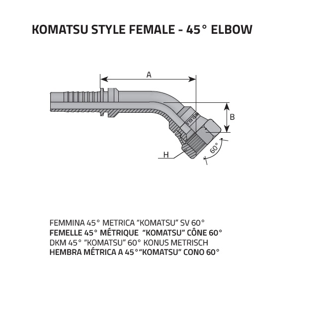 DKM45° - KOMATSU FEMALE SV60°, metrický závit, vnitř. kužel.Pro výběr koncovky k patřičnému průměru hadice slouží údaj "Určeno na hadici [Inch]".