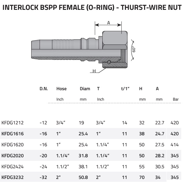 KFDG2020; Celková délka (mm) L=116,5, Provozní tlak (bar) 414, Vnitřní závit 1.1/4"-11, DN (mm) 32, Hmotnost (kg) 0,564, Velikost [modul] (-20), Šestihran 50, Určeno na hadici [mm] 1.1/4"