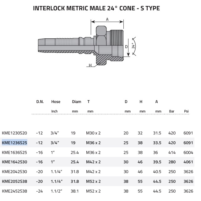 KME1636S25; Provozní tlak (bar) 414, Rozměr vněj. závitu (mm) M36x2,0, Série (S), DN (mm) 25, Trubka (mm) 25, Hmotnost (kg) 0,299, Velikost [modul] (-16), Šestihran 38, Hadice d/D 1"