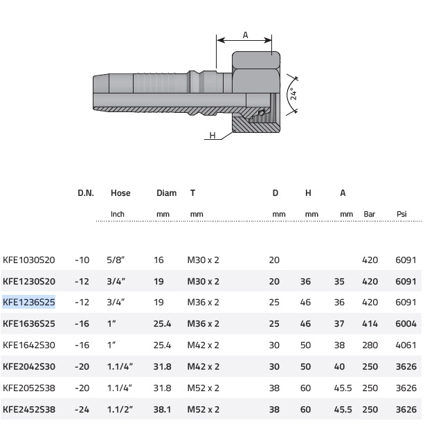 KFE1636S25; Provozní tlak (bar) 414, Vnitřní závit M36x2, DN (mm) 25, Trubka (mm) 25, Hmotnost (kg) 0,24, Velikost [modul] (-16), Šestihran 46, Hadice d/D 1"