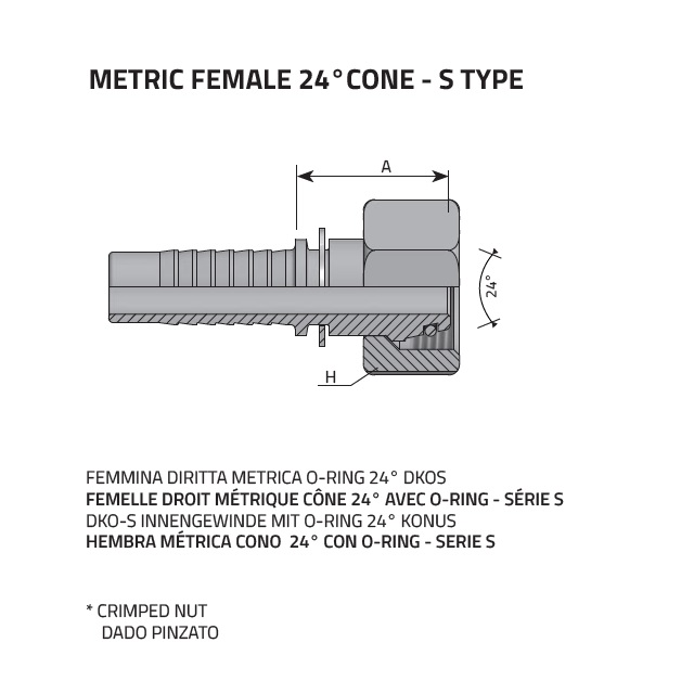 Lisovací nátrubek DKOS 24° pro hydraulické hadice, metrický závit, těžká řada. Vnější kužel 24° s O-kroužkem. Proti strana - koncovky CES. Pro výběr koncovky k patřičnému průměru hadice slouží údaj "Určeno na hadici [Inch]".