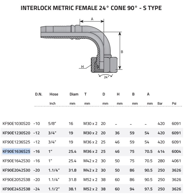 VariantyKF90E1030S20; Celková délka (mm) L=98, Provozní tlak (bar) 450, Vnitřní závit M30x2, DN (mm) 16, Trubka (mm) 20, Hmotnost (kg) 0,2, Velikost [modul] (-10), Šestihran 36, Kóta B 54, Hadice d/D 5/8"
