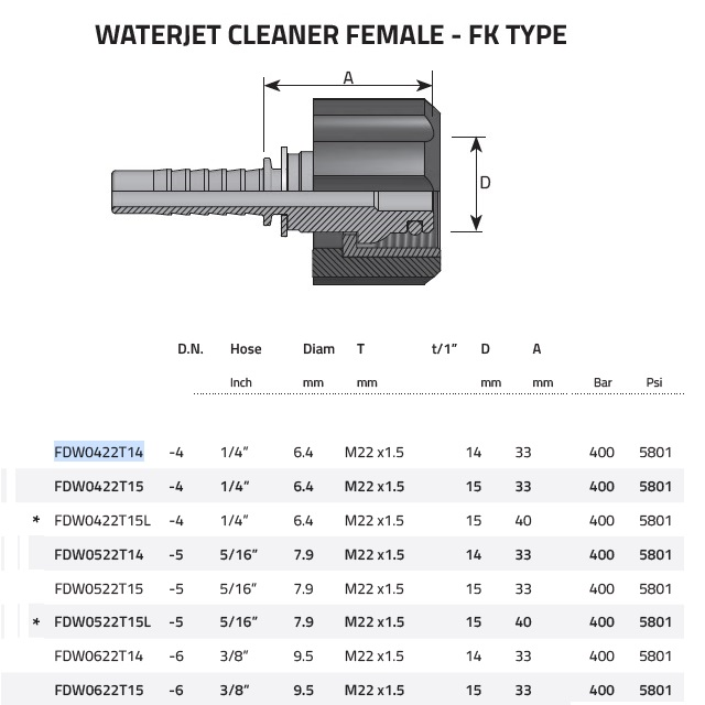 FDW0622T15; Celková délka (mm) L=67, Provozní tlak (bar) 400, Vnitřní závit M22x1,5, DN (mm) 10, D.* (mm) 15, Hmotnost (kg) 0,11, Velikost [modul] (-06), Hadice d/D 3/8"