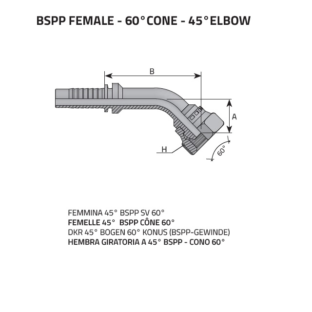 Lisovací nátrubek DKR úhel 45°, vnitřní závit BSP, vnější kužel 60°.Pro výběr koncovky k patřičnému průměru hadice slouží údaj "Určeno na hadici [Inch]".