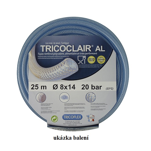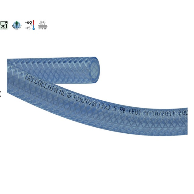 Je vhodný pro styk s potravinářskými výrobky a lze nosit i alkoholy až do 50 % objemu. Vyvážená výztuž zajišťuje vysokou tlakovou odolnost s malou deformací.Vysoce flexibilní, lehká hadice pro přepravu potravin, vody, vzduchu, ovocné šťávy, vína, mléka, mléčné produkty nebo alkoholy do 50% (do teploty +40°C).Vydrží tak dlouhé a časté tlakové impulsy a tlakové cykly.Vysoce výkonná, víceúčelová zesílená hadice potravinářské kvality.Vysoce odolné třívrstvé provedení, z pružného, průhledného PVC třídy A, s vysoce odolným vyztužením polyesterovými vlákny.Víceúčelová hadice vhodná pro různé aplikace: Dodávka stlačeného vzduchu pro nářadí a stroje, přeprava průmyslových plynů, potravin, přeprava určitých chemických produktů (průmysl, lékařství, laboratoře)Poskytuje flexibilitu, dlouhou životnost, vyšší UV odolnost a větší transparentnost.Díky hustému a pravidelně rozloženému propletu nabízí i tlakové použití se zářeznými trny v plastikářském, automobilovém nebo strojírenském průmyslu, je též vhodná pro stlačený vzduch, nářadí a stroje.Hadice neobsahuje ftaláty, není vhodná pro tuky a oleje.Uvedené parametry v tabulce platí při teplotě 20°C.