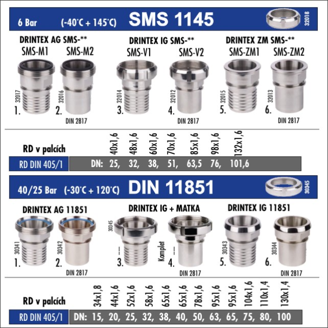Tato položka je dodávaná jako komplet, jednotlivé díly lze objednat i samostatně, viz náhled obrázků.V EU se používají potravinářské spojky SMS 1145 (švédská výrobní norma) pro potravinářský, chemický a farmaceutický průmysl.Potravinové spojky SMS 1145 jsou připojeny stejným způsobem jako v souladu s DIN 11851.