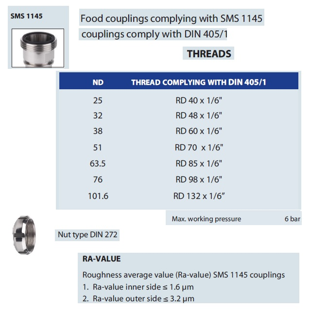 V EU se používají potravinářské spojky SMS 1145 (švédská výrobní norma) pro potravinářský, chemický a farmaceutický průmysl.Potravinové spojky SMS 1145 jsou připojeny stejným způsobem jako v souladu s DIN 11851.