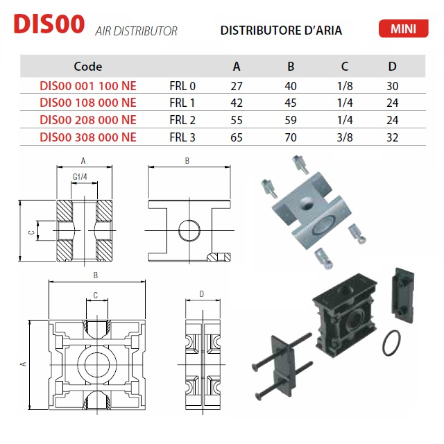 DIS00108000NE; Vnitřní závit G 1/4", Série FRL-1, Pístnice 24, Hmotnost (kg) 0,165, Kóta B 45, Kóta A 42