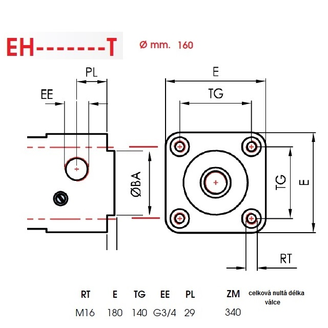 VariantyEH1600150T; Provozní tlak (bar) 1-10, Rozměr vněj. závitu (mm) M36x2, Zdvih (mm) 150, Vnější průměr (mm) 180, DN (mm) 160, Pístnice 40, Hmotnost (kg) 14,6