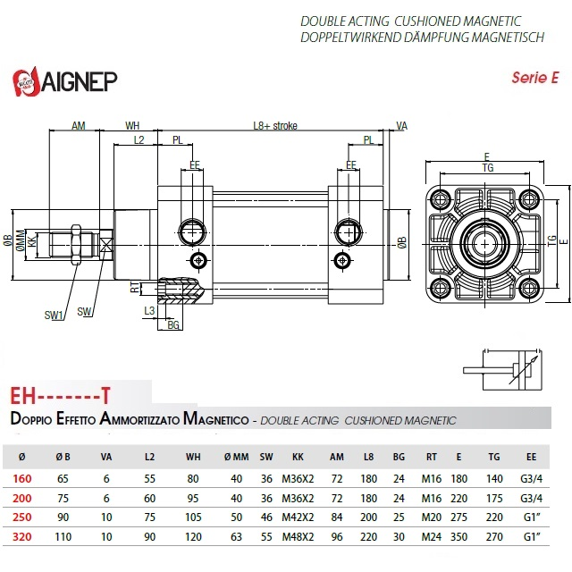 Průměr válce je od 160 mm do 320 mm, zdvih válců od 25 mm do 1000 mm (menší průměry viz nová řada LH).Dvojčinné válce pracují na principů dvou tlakových přívodů (vtoků), které převedou tlakovou energii na axiální výsun pístnice, čímž konají práci, nepotřebují zpětnou pružinu na výchozí polohu.Hlavní charakteristikou těchto válců je pevnost a spolehlivost díky výrobní struktuře.Splňují maximální požadavky na výkon a zatížení při posunech, mají magnetické tlumení na konci zdvihů. Tlumení se jednoduše seřizuje dvěma zapuštěnými šroubky na každém konci samostatně.U dvojčinných válců se používají zejména 5/2 a 5/3 ovládací ventily.Při objednání je důležité znát typ válce, průměr válce v mm a zdvih v mm: viz příklad kódu: EH2000160T (poslední 3 čísla v kódu je zdvih v mm - "160").