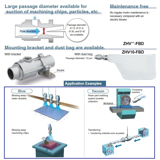 Zesilovač průtoku "ejektor", řada ZHV.Snižuje spotřebu stlačeného vzduchu, přičemž 4-násobně zesílí průtok vzduchu pro ofuk. Nebo umožňuje 3-násobné zesílení sacího výkonu.Nastavitelný průtok ofuku (až 6280 l/min) a sací výkon (až 5270l/min).Výhody: pneumaticky ovládaný, bezúdržbový.Průměry průtočného průřezu: 13, 21.6, 30 a 42 mm. Otočením trysky proti směru hodinových ručiček se průtok zvyšuje (zvýšení hodnoty vakua).Otočením trysky po směru hodinových ručiček se průtok snižuje (snížení hodnoty vakua).Volitelné doplňky jsou upevňovací úhelník a prachový vak - viz údaj o mikrónech.