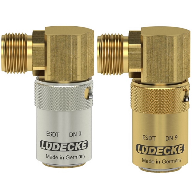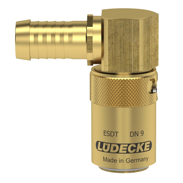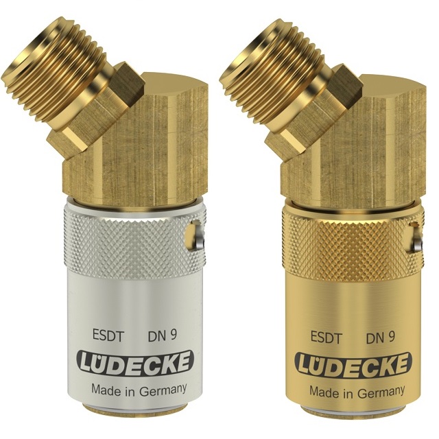 ALM - Automatický zajišťovací mechanizmus (Automatic Locking Mechanism) - patent Lüdecke.Temperovací rychlospojky Série ESDT DN 9 s velikostí průměru čepu 13,5 mm z mosazi 2.0401.Pro aplikace regulace teploty s horkou nebo studenou vodou a temperovaným olejem.Nejbezpečnější a nejžádanější rychlospojky v plastikářském průmyslu (práce s horkými médii).Oproti zajištění typu S, (např. série ESD nebo ESDF) dostávají přednost zejména kvůli bezpečnostni např. v hustém provozu s horkými oleji (horkou vodou).Verze s přídavným těsněním O-kroužkem na připojovacím portu, aby se zabránilo úniku při vysokoteplotních aplikacích.Pro spojení se zástrčkou řady ESD DN 9.Systém ESD je plně kompatibilní s americkým systémem DME 3/8", nikoliv Hasco.