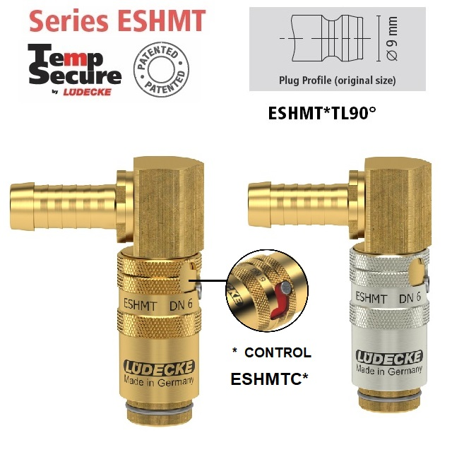 Rychlospojky s dokonalým zabezpečením proti samovolnému uvolnění. Kompatibilní s Hasco Z8.Patentovaný systém "Temp Secure" určený zejména pro plastikářský průmysl. Pro rok 2022 výrobce Lüdecke doplnil řadu o barevně svítící destičky, viz video u sekce. Kody jsou v případě tohoto provedení ESHMT* změněné na ESHMTC*.Velikost vsuvky 9 mm s automatickým zajišťovacím mechanismem.Vnější průměr nasazovaných vsuvek série DN 6 je 9 mm (do rychlospojek). Pro aplikace regulace teploty s horkou nebo studenou vodou a temperovaným olejem. Mosazné tělo i objímka, vnitřní kuličky a pružiny z nerezu, těsnění viton.