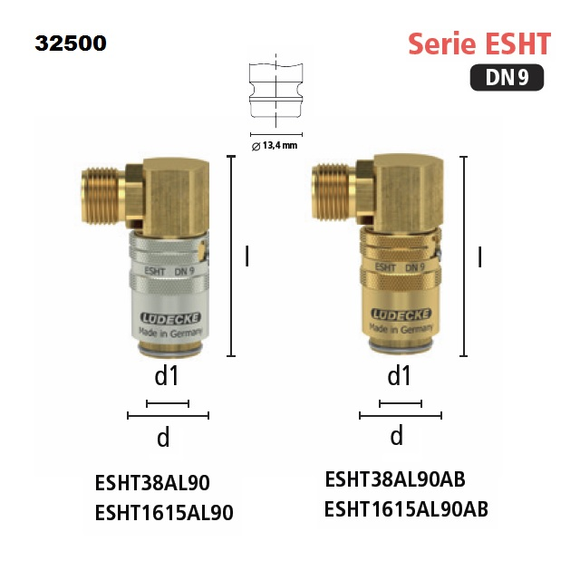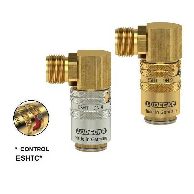 Rychlospojky určené pro plastikářské stroje a formy s patentovaným automatickým bezpečnostním zajišťovacím mechanismem. Pro aplikace, kde je zapotřebí udržení stálé teploty horkou a studenou vodou, popřípadě temperovacím olejem.Kompatibilní s Hasco Z8. Připojovací části, ventilové tělo, ventil, vsuvky z mosaz MS 58/materiál 2.0401.Pružiny a rozpěrný kroužek z nerezové oceli 1.4310, koule - nerezová ocel 1.4034, těsnění: Viton.Rozměr čepu vsuvky 13 mm.Jednoruční systém spojení umožňuje velice snadná a rychlá spojení rychlospojky s protikusem (s hadicí a koncovkou).Temp Secure (bezpečnostní patentovaný systém výrobce Lüdecke) - význam je v zabránění náhodnému rozpojení, cílem je zabezpečení.Sérii DN 9 jsou díky tvarům a způsobu rozpojování 2 typy zajištění 1. Tvar Z a 2. volitelným požadavkem zajištění "S". Kombinovaná tlakově torzní pružina a zesílené uvolňovací pouzdro z vysoce odolné speciální mosazi.Volitelně s přímými, jednoduchými nebo dvojitými uzavíracími ventily, pro spojení se zástrčkou řady ESH DN 9.Pro rok 2022 výrobce Lüdecke doplnil řadu o barevně svítící destičky, viz video u sekce. Kody jsou v případě tohoto provedení ESHT* změněné na ESHTC*.