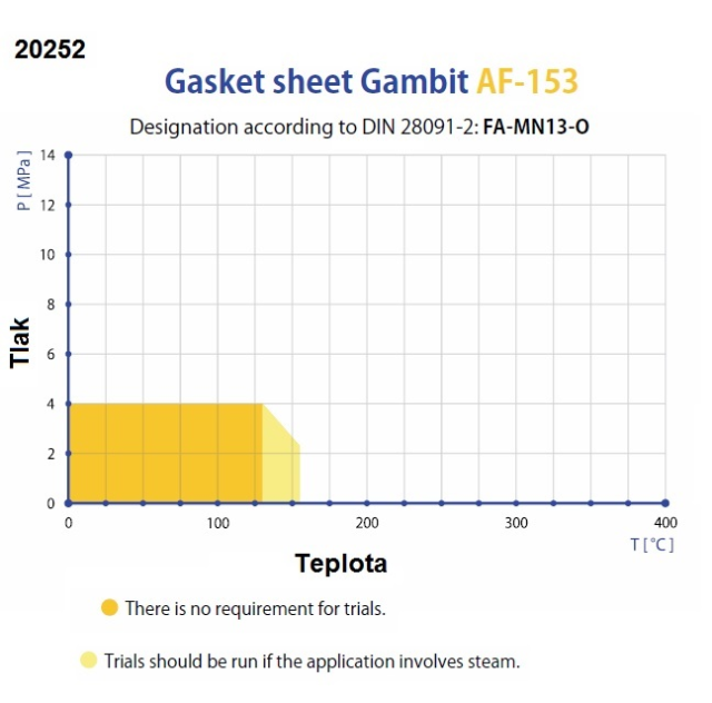 AF-153 je bezazbestový těsnící materiál na bázi přírodních, minerálních vláken pojených směsí NBR/NR/SBR. Formát desek: 1500 x 1500 mm (na poptávku 1500 x 3000 mm), tolerance +/- 10%.Použití: Deska vhodná k výrobě těsnění - vodovodní a kanalizační zařízení, rozvody horké vody, glykolů nebo páry.Chemická odolnost: - částečná odolnost benzínům, dobrá odolnost - etylén glykol, etyl, metyl, mořská voda, silikonové oleje, vzduch.Přírubová zkouška dle DIN 52913: Reziduální tlak 50 MPa /16 h /175 ° C / (min.) = 20 MPa.Parametry platí pro těsnění s tloušťkou 2,0 mm.Nabízené služby: Strojní řezání na pásky, tvarové řezání těsnění na digitálním plotru.