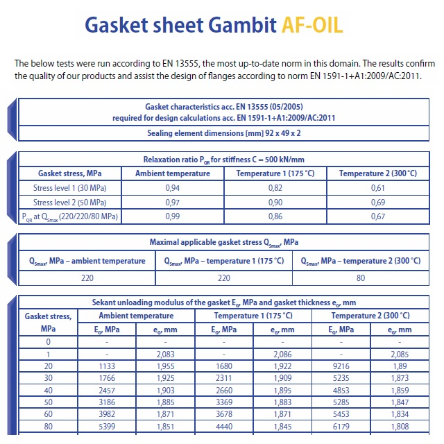 GAMBIT AF-OIL je vyrobena z vysoce kvalitních materiálů, minerálních vláken pojených směsí NBR. Záporná teplota až -60°C je u bezazbestových deskek jedna z nejnižších (jaderné elektrárny).Formát desek: 1500 x 1500 mm. Použití: jako těsnění u průzorů (dozorové spoje) u plynových a palivových rozvodů.Deska je odolná proti vodě (mořské vodě), páře 230°C, petroleji, palivům, olejům a roztokům solí, zemním plynům, propan-butanu, slabé kyseliny i zásady (kyselina mravenčí, otová, sírová 20%, Ethyl glykol, hydroxid amonný a draselný, manganistan draselný atd.Nasákavost - bobtnavost dle ASTM F146: - vůči oleji IRM 903 150°C/5hod. (max.) = 6%, - vůči palivům třídy B 20°C/5 hod. (max.)= 6%, - vůči naftě 20°C/24 hod. (max.) = 5%. Pevnost ve střihu = 9 MPa DIN 52910Přírubové zkoušky dle DIN 52913: Reziduální tlak 50 MPa /16 h /300° C / (min.) = 29 MPa, Reziduální tlak 50 MPa /16 h /175° C / (min.) = 35 MPa. Hodnoty uvedené v tabulce se týkají desek o tloušťce 2,0 mm.Nabízené služby: Strojní řezání na pásky, tvarové řezání těsnění na digitálním plotru.