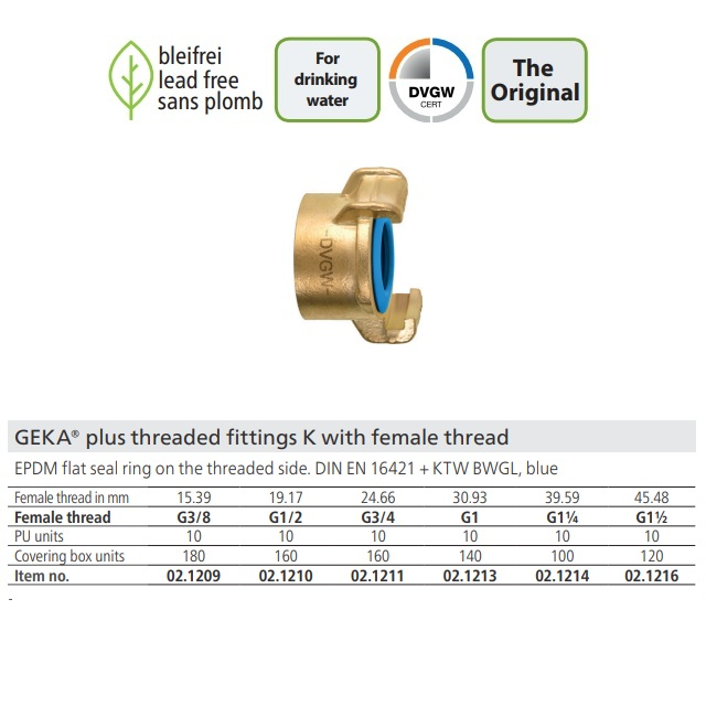 Rychlospojky GEKA® plus jsou profesionálním řešením pro bezpečné a hygienicky nezávadné rozvody pitné vody. Jsou vyrobeny z bezolovnaté mosazi CW508L-DW a osazeny modrým EPDM těsněním, které jednoznačně označuje použití v oblasti pitné vody a splňuje nejpřísnější hygienické normy.Pro dočasný transport pitné vody podle normy VP550 - vhodné pro použití v potravinářství, v instalacích pitné vody na zahradách a venkovních prostorách.Také vhodné pro použití s chlorovanou vodou, např. ve veřejných bazénech nebo u chlorované pitné vody. Jednoduché spojování hadic.Rychlospojky je možno osadit na veškeré dodávané hadice s uvedeným vnitřním průměrem nebo běžná zakončení s G" závitem. K upínání do hadic doporučujeme šnekové nebo čelisťové spony.