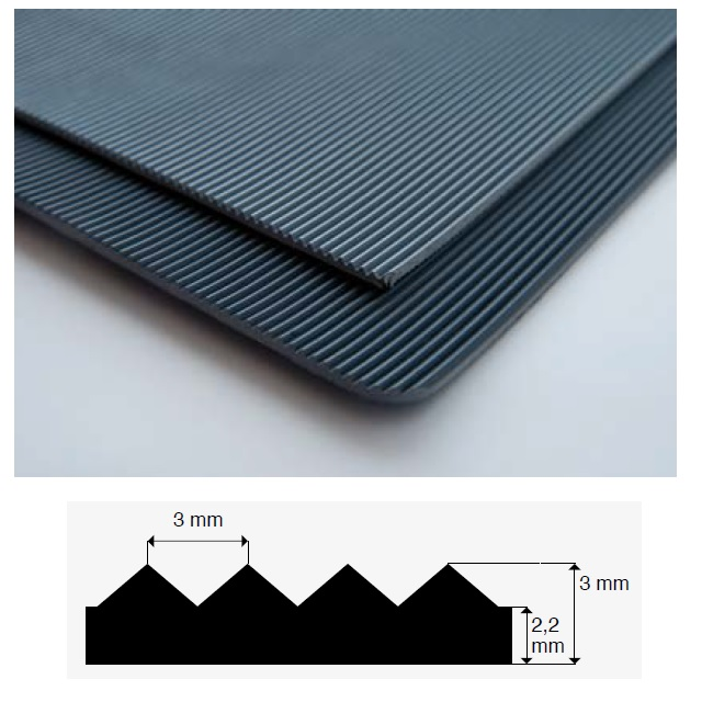 Podélně rýhovaná podlahovina s tloušťkou 3 mm. Protiskluzový žebrovaný povrch na jedné straně a jemný vzor otisku na druhé straně.Volně položené aplikace na podlahy, chodníky, lišty, ložné plochy, pracovní stoly a plochy pro všeobecné použití.Nabízené služby: Strojní řezání pryže na pásky, řezání tvarového těsnění na digitálním plotru.