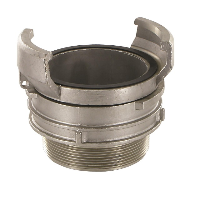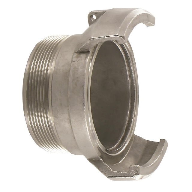 Nerezová koncovka GUILLEMIN - symetrické bajonetové spojky jsou určeny pro transport a přepravu kapalných i sypkých látek a granulátů např. sila, cisterny vagonů, zemědělský a chemický průmysl.Konstrukce spojky je francouzsko-belgického původu a odpovídá normě EN 14420-8 / NF E 29-572.Identické poloviny spojky se dvěma západkami jsou spojeny mezi sebou přiložením těsnících ploch k sobě a následným otočením obou uzavíracích prstenců tak, aby zapadly do západek. Pro utažení je potřeba použít hákový klíč Guillemin.Standardní těsnění (NBR) Buna (černá). Další možnosti BUNA (bílá), Guillemin VITON, Guillemin PTFE.Nejsou vhodné pro plyny a páru.Na přání možnost dodat v mosazném provedení.