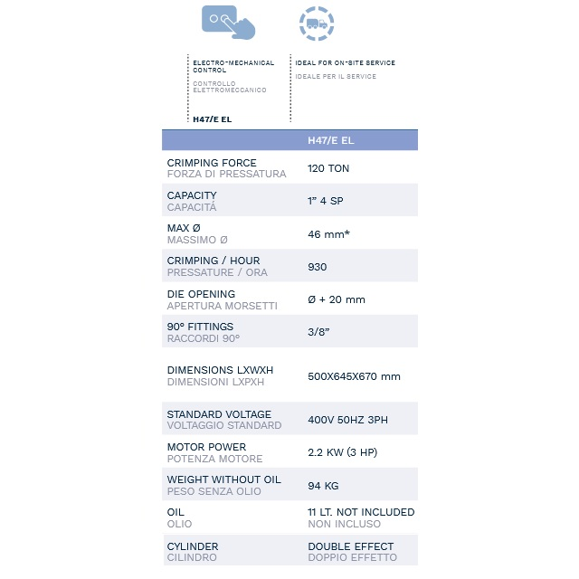 TUBOMATIC H47/E EL je elektricky poháněný tlakový lis určený pro lisování (krimpování) hydraulických hadic a jejich konektorů.Upínací síla 120 tun.Je určen pro lisování hydraulických hadic do průměru 46mm a hadic do 1" se 4 opletyLisovat lze i hadice s koncovkami tvaru 90° (tzv. „kolena“), a to do velikosti 3/8.Rozměry: 500x645x670 mmK lisu je možné dokoupit sadu čelistí ARTIKL: 54625
