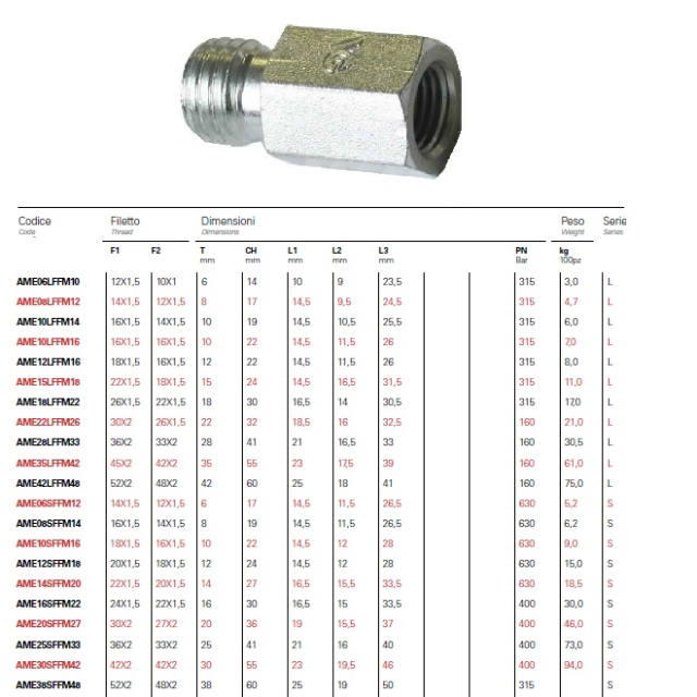 AME08LFFM12.1; Provozní tlak (bar) 315, Vnitřní závit M12x1,5, Série (L), Připoj. závit AM14x1,5, Trubka (mm) 8L, Hmotnost (kg) 0,005, Šestihran 17