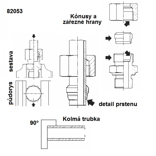 Připojovací závit se zářeznou hranou dosedací plochy do kostky (tělesa), bez těsnění, z materiálu nerez DIN 1.4571. Tabulka je doplněná i holými hrdly, kde před polmčkou "-SS" je vložena ".1"