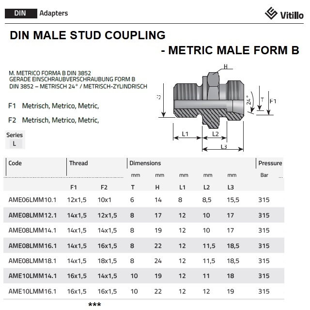 AME08LMM12.1; Provozní tlak (bar) 315, Rozměr vněj. závitu (mm) M14x1,5, Série (L), Připoj. závit M12x1,5, Průměr (mm) d=17, Trubka (mm) 08L, Hmotnost (kg) 0,022, Šestihran 17
