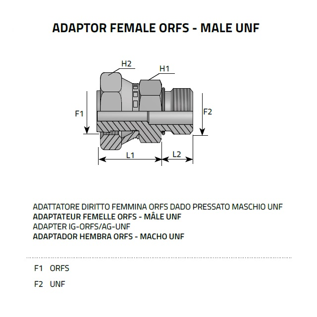 AFGO13MU12; Celková délka (mm) 57,5, Provozní tlak (bar) 420, Vnitřní závit ORFS 1", Vnější závit UNF 1.1/16", Délka závitu (mm) AG=18,5, Hmotnost (kg) 0,19, Šestihran 32/30