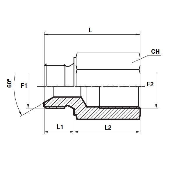 APMFG0860; Celková délka (mm) 60, Provozní tlak (bar) 200, Vnitřní závit G 1/2", Vnější závit G 1/2", Délka závitu (mm) L1=14, Délka nátrubku (mm) L2=46, Hmotnost (kg) 0,03, Šestihran 27
