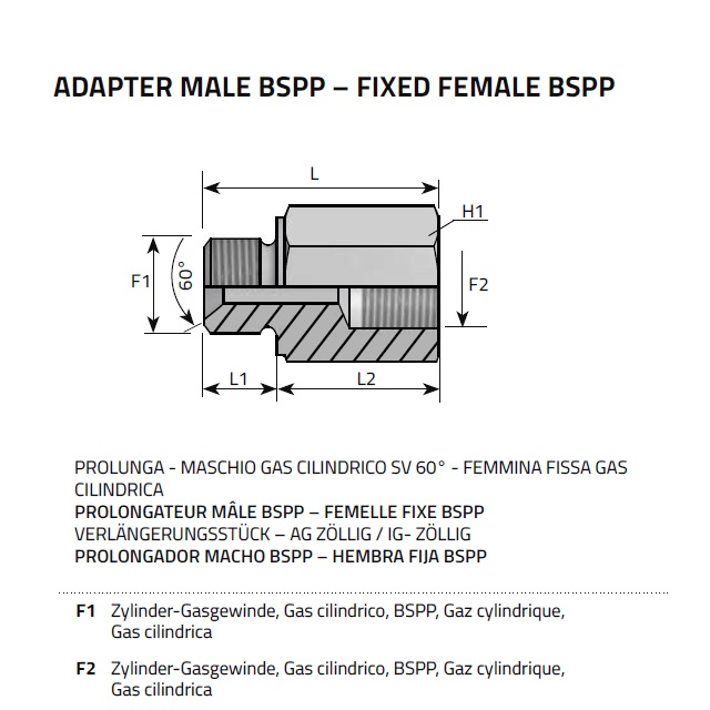 APMFG0864-02; Celková délka (mm) 64, Provozní tlak (bar) 200, Vnitřní závit G 1/2", Vnější závit G 1/2", Délka závitu (mm) L1=14, Délka nátrubku (mm) L2=46, Hmotnost (kg) 0,033, Šestihran 27
