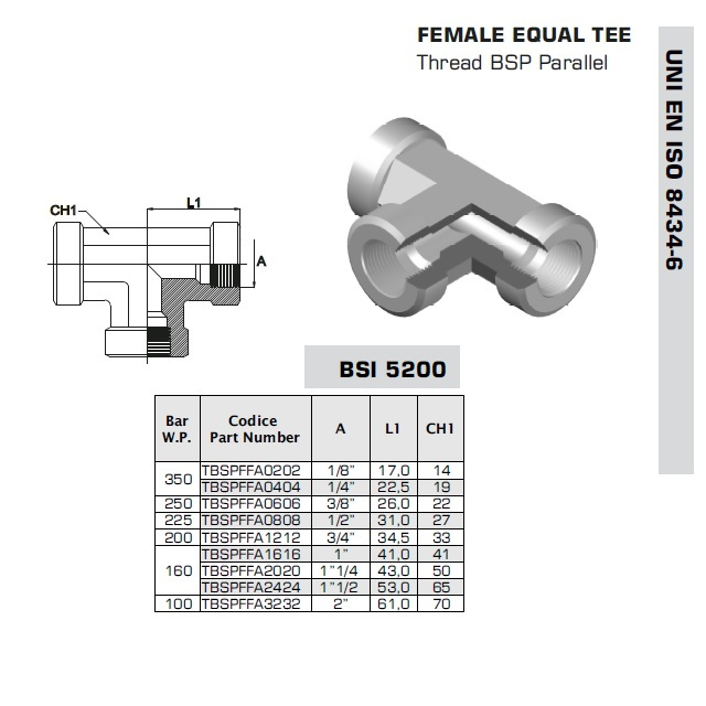 VariantyTFG06-SS; Celková délka (mm) L=52,0, Provozní tlak (bar) 250, Vnitřní závit 3x G3/8", Hmotnost (kg) 0,144, Šestihran 22