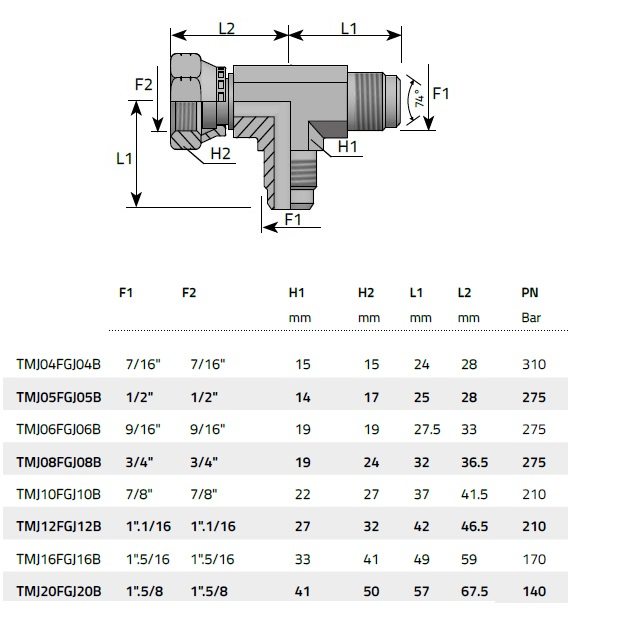 TMJ04FGJ04B; Provozní tlak (bar) 310, Vnitřní závit 7/16", Šířka (mm) 28, Vnější závit 7/16", Druhý průměr (mm) L1=24, Hmotnost (kg) 0,03, Šestihran 15/15