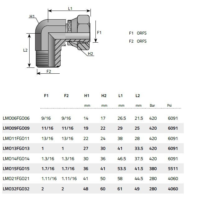 LMO15FGO15; Provozní tlak (bar) 420, Vnitřní závit 2x1.7/16", Vnější závit ORFS 1.7/16", Hmotnost (kg) 0,29, Šestihran 36/41