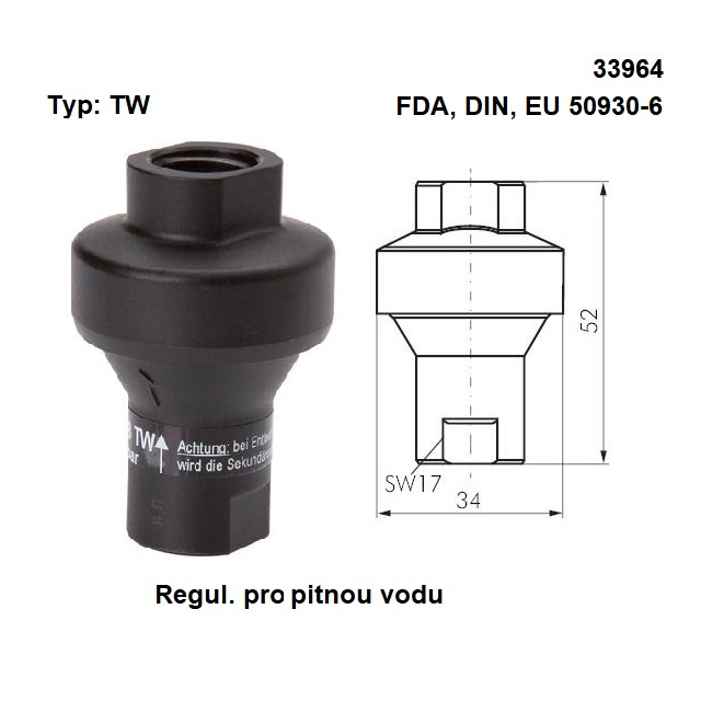 Jedno směrný ventil pro přímou redukci tlaku v provedení MS nebo PA66. Výběr položek dle parametrů redukčního tlaku. S nastaveným tlakem výrobce nelze již manipulovat. Médium: Voda (také pro pitnou voda a tekuté potraviny lze dodat z materiálu PA66, dle TKW).