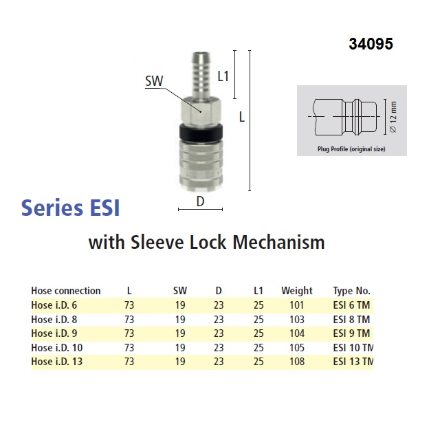 VariantyESI6TM; Celková délka (mm) 73, Provozní tlak (bar) 35, Rozměr nátrubku (mm) 6, DN (mm) 7,8, Hmotnost (kg) 0,095, Šestihran 19, Určeno na hadici [mm] 6