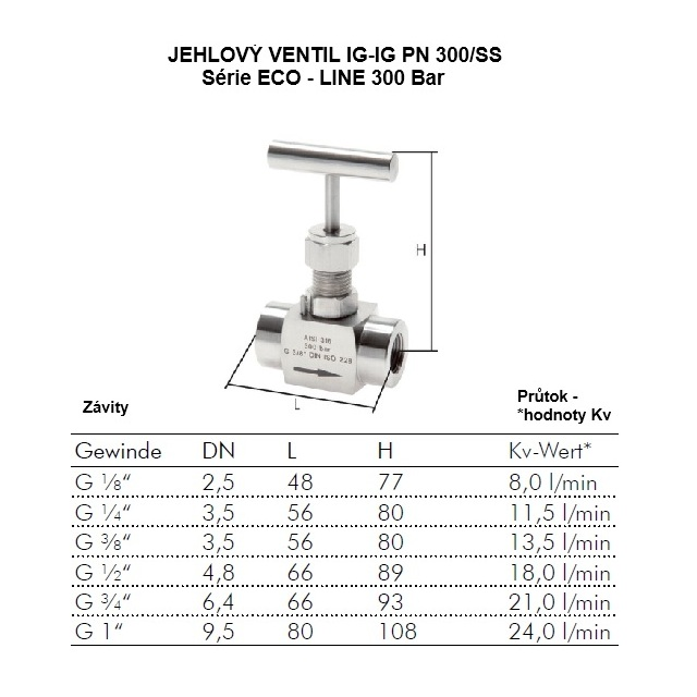 Uzavírací jehlové ventily jsou určeny pro průmyslové aplikace. Těsnicí sedlo a kovové těsnění. Teflonová těsnění (PTFE) jsou umístěna uvnitř na vřetenu.Tabulka obsahuje *průtok, jde o průtok čisté vody při +20°C a 1 bar (na vstupu ventilu), dále volný výtok. Průtok pro vzduch je cca x 13,4 kv x Pvstup (l/min). Údaje o tlaku se vztahují, pokud není uvedeno jinak, ke kapalinám skupiny II. při +20°C.Všechny údaje se rozumějí jako nezávazné směrné hodnoty!Za výběr údajů nepotvrzených písemně nepřebíráme žádnou záruku.