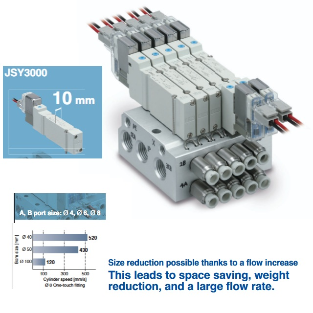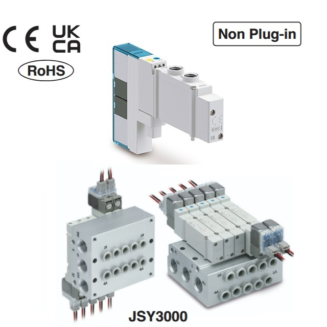 JSY3000, Ventil (všechna provedení). Stupeň krytí: až IP67, odolné vůči vodě, dešti.Ventily s minimálními zástavbovými rozměry a nízkou hmotností.Zvýšení produktivity – výrazné zkrácení doby cyklu!Podpora efektivity energií: provedení s nízkým příkonem 0.1 W zabraňuje zahřívání.Příkon: 0.4 W (standardní provedení), Volitelné 0.1 až 0.2 W (provedení s nízkým příkonem).Interní prodrátování nebo individuální elektrické připojení. Výstupy i ze strany (zdola u individuálního elektrického připojení). Možné aretace: D: tlačítko s drážkou, E: s páčkou s aretací (standardně bez aretace).Snadná montáž a rychlá výměna.