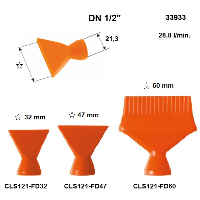 VariantyCLS121-FD32; Provozní tlak (bar) 6, DN (mm) 12, Hmotnost (kg) 0,008, Velikost [modul] 1/2", Provedení Tryska šíře 32