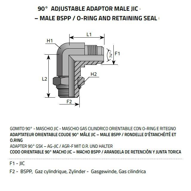 Koleno 90° stavitelné AG-BSPP, JIC, kužel 74°.