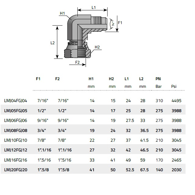 LMJ04FGJ04; Provozní tlak (bar) 310, Vnitřní závit 7/16", Vnější závit 7/16", Hmotnost (kg) 0,04, Šestihran 14/15