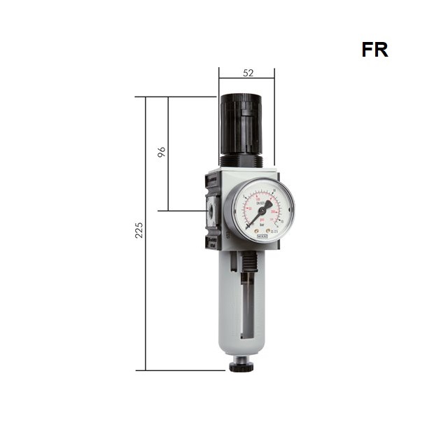 Kompletně vybavený filtr "FUTURA" 5 µm a regulátor 1-16 bar osazený manometrem. Filtr pro vzduch a plyny s plastovým tělesem a výpustnou nádobou kondenzátu. Výpusť poloautomatická. Funkce vypouštění (poloautomat): Pokud klesne vstupní tlak pod min. vstupní tlak, automaticky se otevře vypouštěcí ventil. Přitažením vypouštěcího šroubu lze zamezit poloautomatickému otevírání vypouštěcího ventilu.Rozsah regulace průchozího tlaku je parametricky volitelný, výrobcem nastavený.Regulátor tlaku řízený ve zpětném směru (se sekundárním odvzdušněním) s dodatečnou filtrací podle principu odstředivky a s filtrem ze spékaného kovu.Ruční kolečko je možné stlačením zaaretovat a zamknout pomocí zámku. Průtoky vzduchu: u závitu 3/8" = 4.500 l/min., u 1/2"=5.200 l/min. Sekundární ventilace: 70 l/min.Filtr lze upevnit za horní závit M 42x1,5. Objem kondenzační nádobky je 49 cm3.