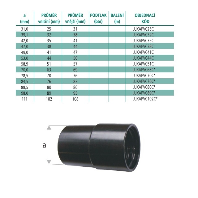 VariantyLUXAPVC25C; Vnější průměr (mm) 31, Vnitřní průměr (mm) 25, DN (mm) 25, Hmotnost (kg) 0,02
