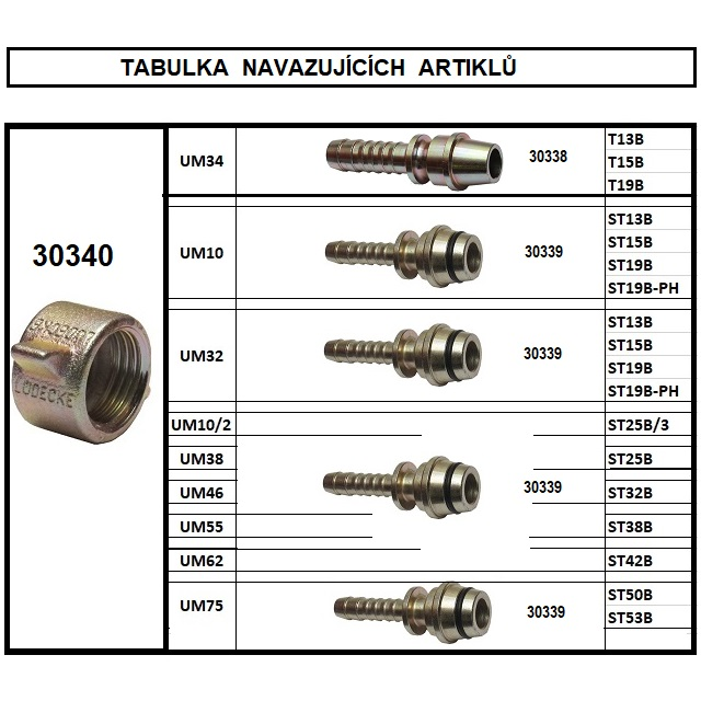 Šroubení pro připojování tlakových hadic, zejména určené pro tlakový vzduch, tlakovou vodu, stavební kompresory, pneumatické nářadí apod.Šroubení odpovídá normě DIN 8537 / 20 033, pro kónusy 1:3 a 1:4, závity palcové, "G" Whitworth.Závit s označením Rd je Whitworthuv oblý závit, nejvíce používaný u vagonů, jako spojovací.Celosvětově používaný systém pro stlačený vzduch, vodu, ve stavebnictví a hornictví.Adekvátní hadicové trny "KONUS PŘÍPOJKA TRN", které přímo pasují na rozměry matic UM jsou zpracovány v jejich sekci. Viz související výrobky.