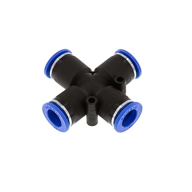 Plastová křížová spojka 10 bar.Jednoruční provedení fungující na principu připojení jedním stisknutím umožňuje okamžité připojení hadic.Uvedené průměry hadic jsou vnější průměry kalibrovaných hadic PA nebo PU.