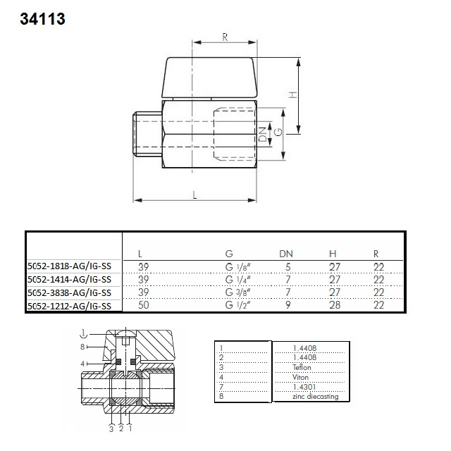 Pouzdro a kulička: 1.4408, šroub s rukojetí: 1.4301