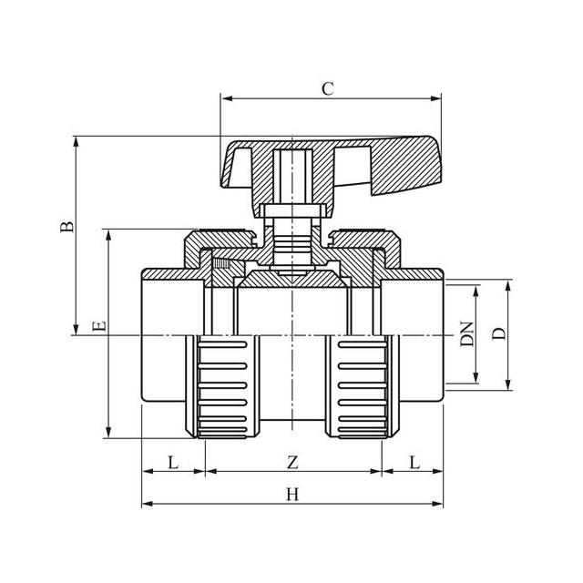 Výhody: radiální, lze instalovat a demontovat, kuličku bezpečného plováku, optimální vlastnosti průtoku.Poznámka: Nepoužívejte žádné prostředky na utěsnění závitů, které by poškodily PVC-U, pouze pro plastové závity.